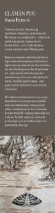 Susu Rytteri: Elämän puu. Valtaosa eläinkunnasta on hyönteisiä. Näyttelyssä tutkitaan puiden ja puista riippuvaisten hyönteisten arvoa. Metsäluonnon hoitamiseen ja suojeluun liittyvien kysymysten mutkikkuus on innoittanut Susu Rytteriä piirtämään, maalaamaan ja kaivertamaan koivun tuoheen sarjan perhosaiheisia teoksia. Kaikki näyttelyn perhoslajit syövät toukkavaiheessa puuvartisia kasveja.