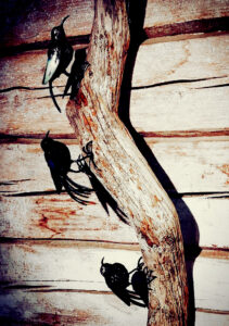 Rauni Vastinesluoma: Lintuveistoksia. Näyttely koostuu takomalla ja hitsaamalla veistetyistä lintuaiheista.