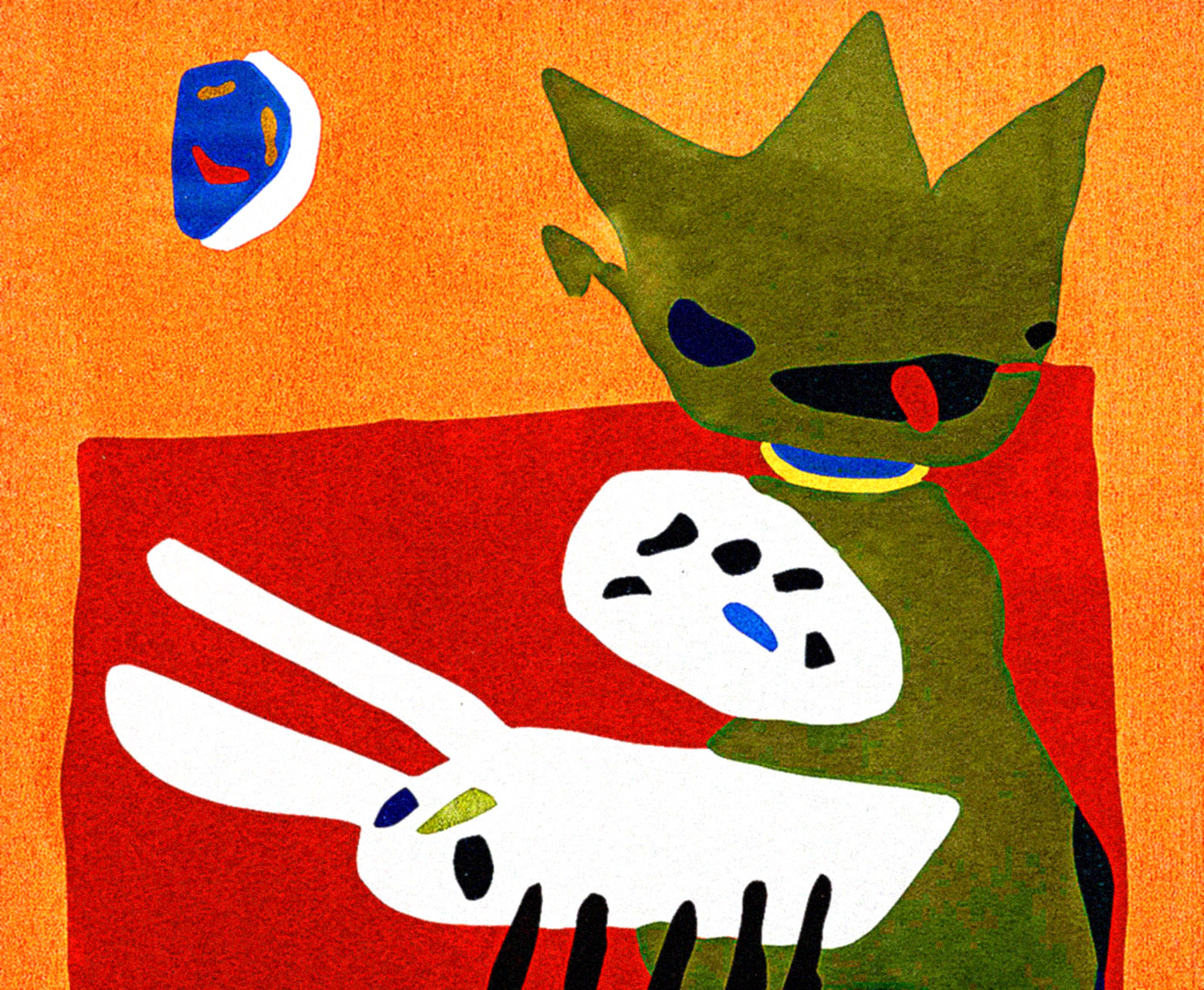 Riitta Nelimarkka. Jänis saa sopivan lahjan. Grafiikka 105/125. Kehystetty 51X45 cm.