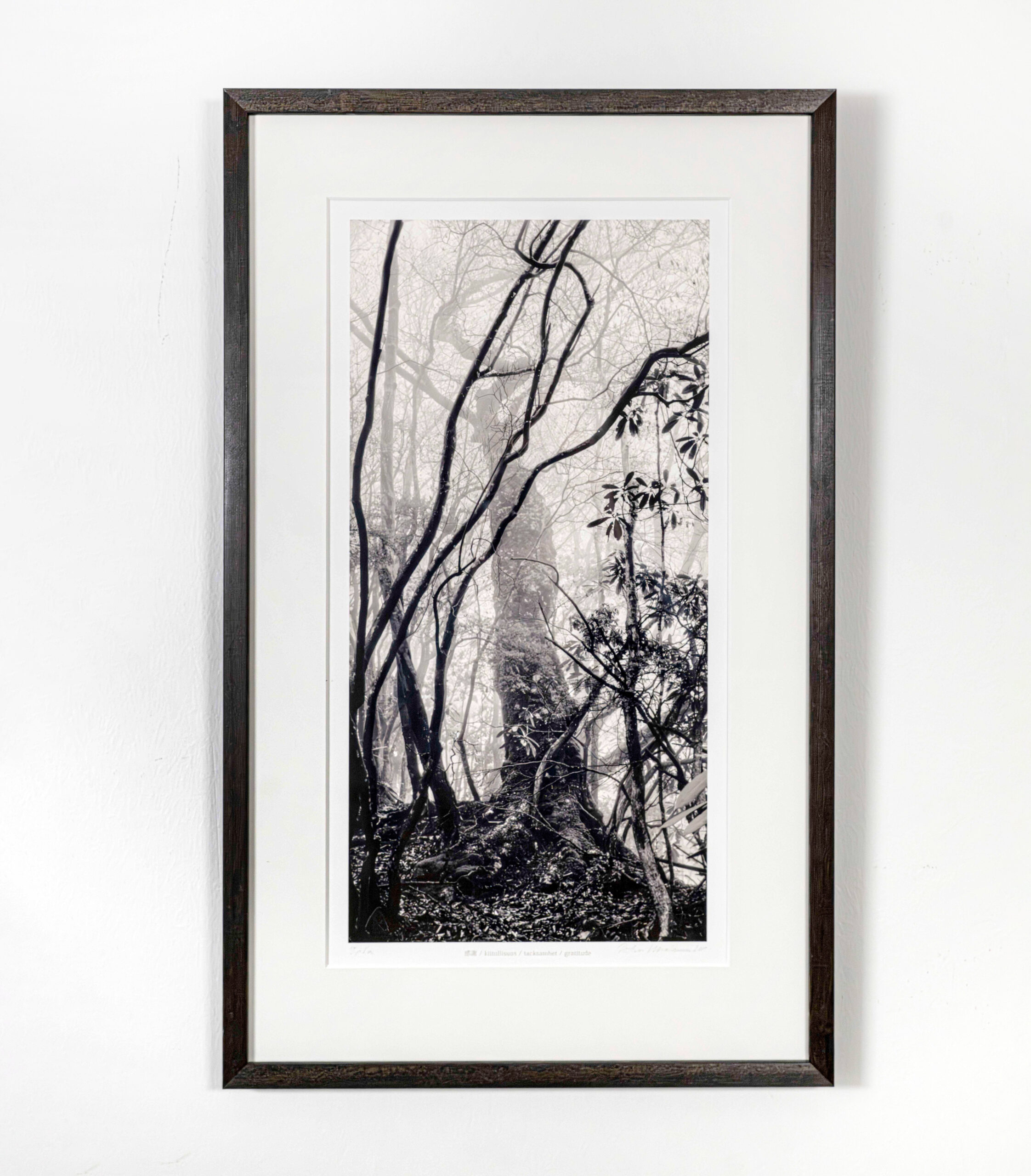 Kehystys- ja ripustustietoja: Musta puukehys, lämmin paspartuuri.