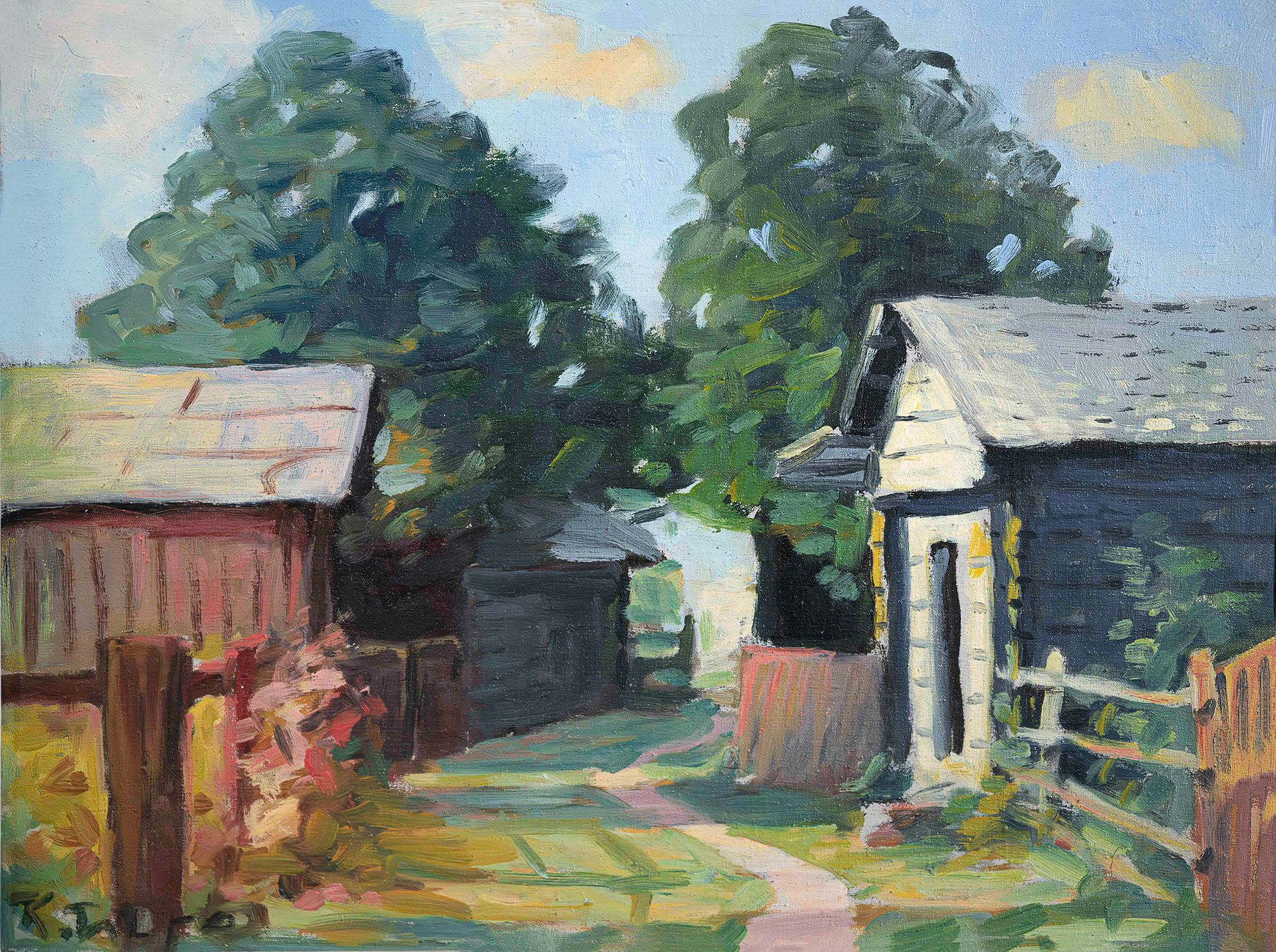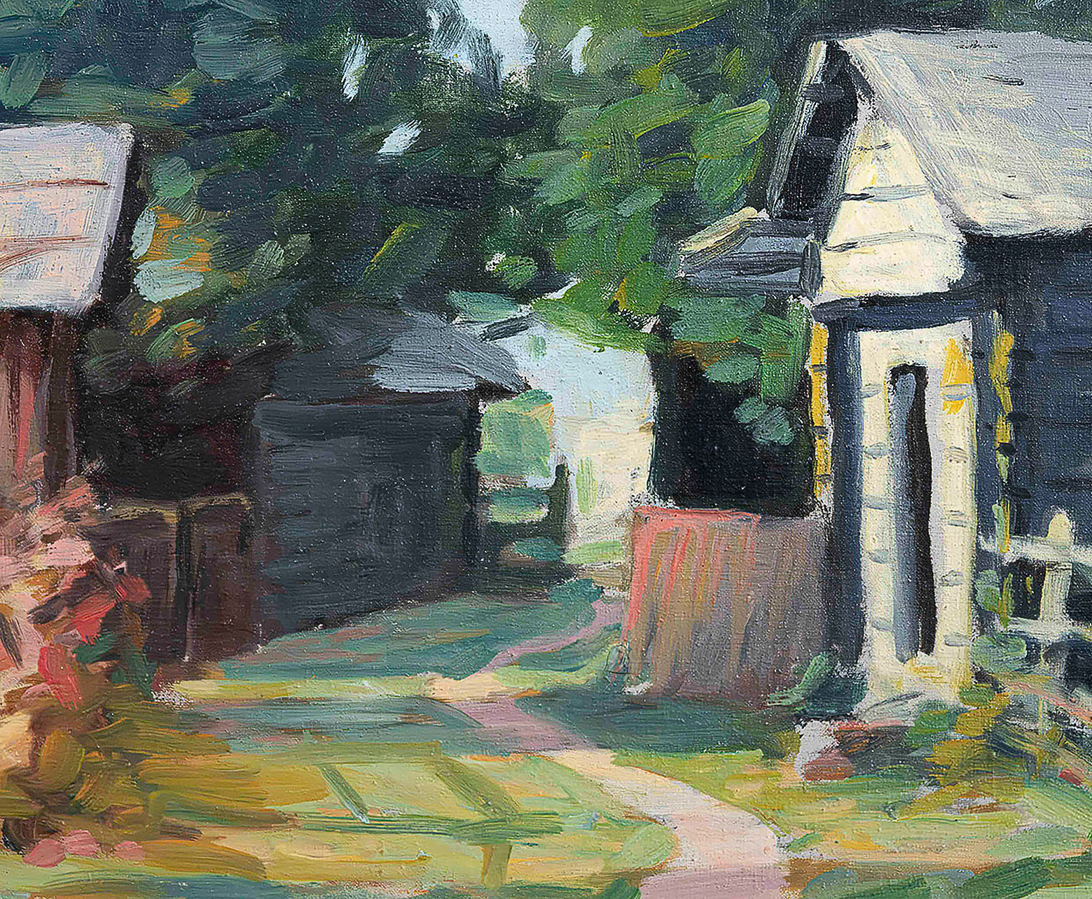 Kauko Talpo. Kylänäkymä. Öljy kankaalle, kehystetty. 40×50 cm.