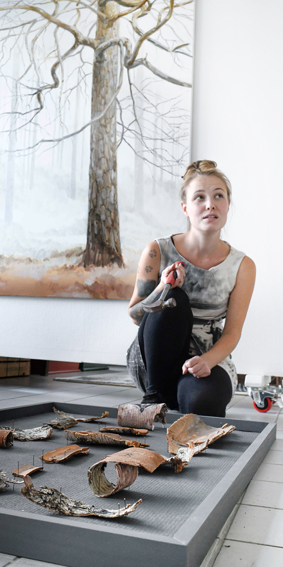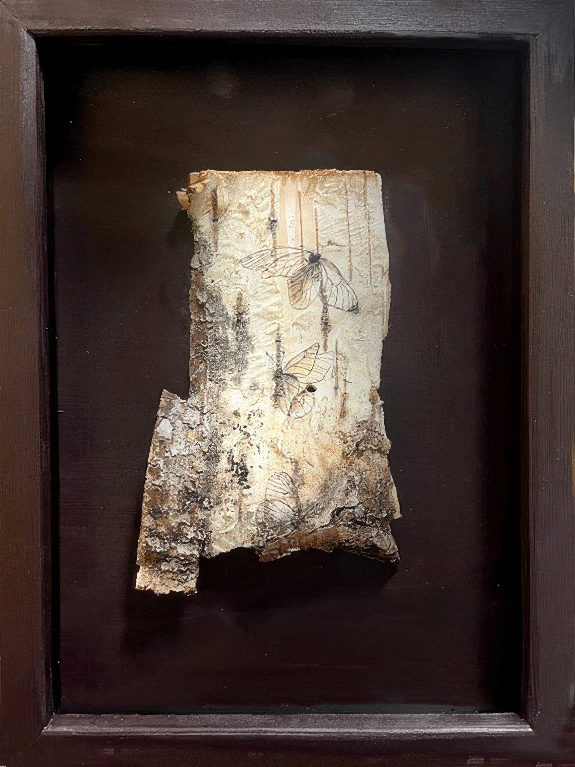 Susu Rytteri. Pihlajaperhoset, 2025. Muste koivuntuohelle, vitriinikehys, 38X26 cm. Heijastamaton lasi.
